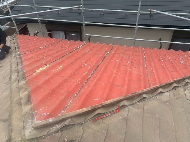 ↑かわらUを剥がしてみるとやはりルーフィングを敷いていません・・・