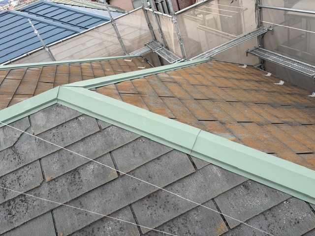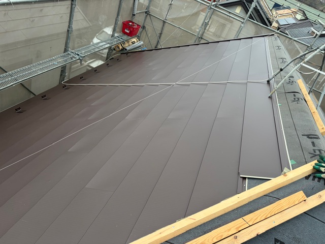 いつもの様に既存屋根材の上にルーフィングを敷き、新規屋根材を葺いていきました。